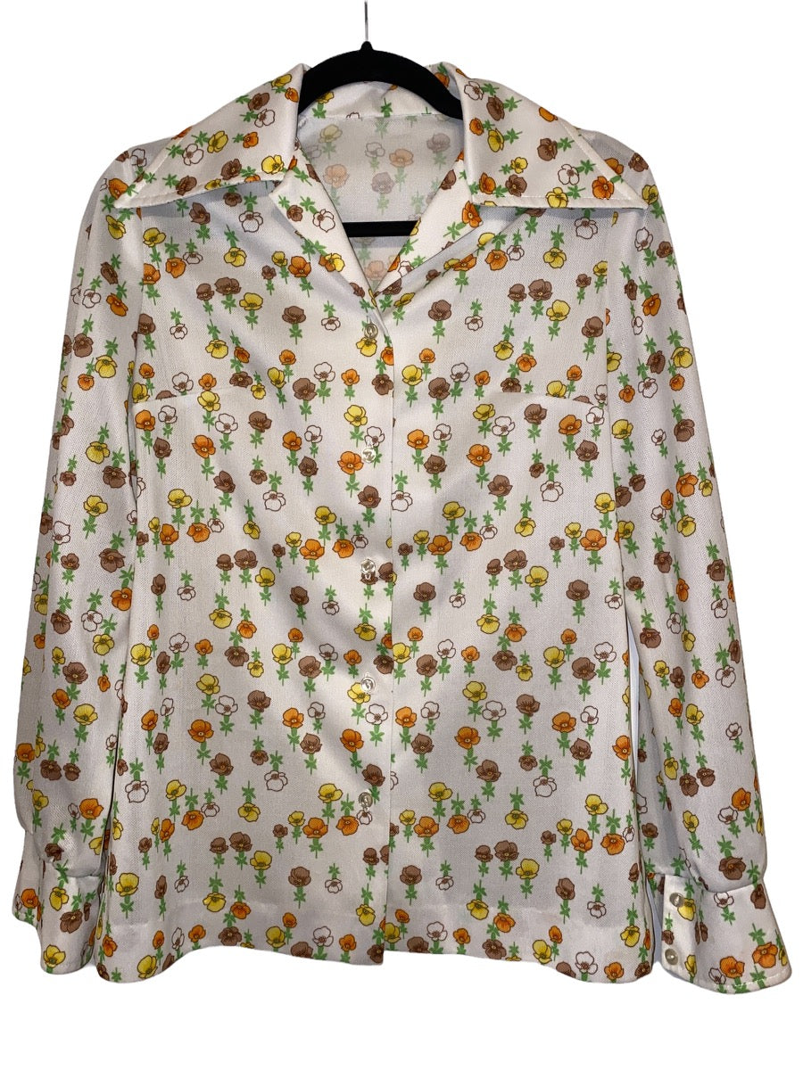 1970's Womens Wide Lapel Flower All Over Print Button Up