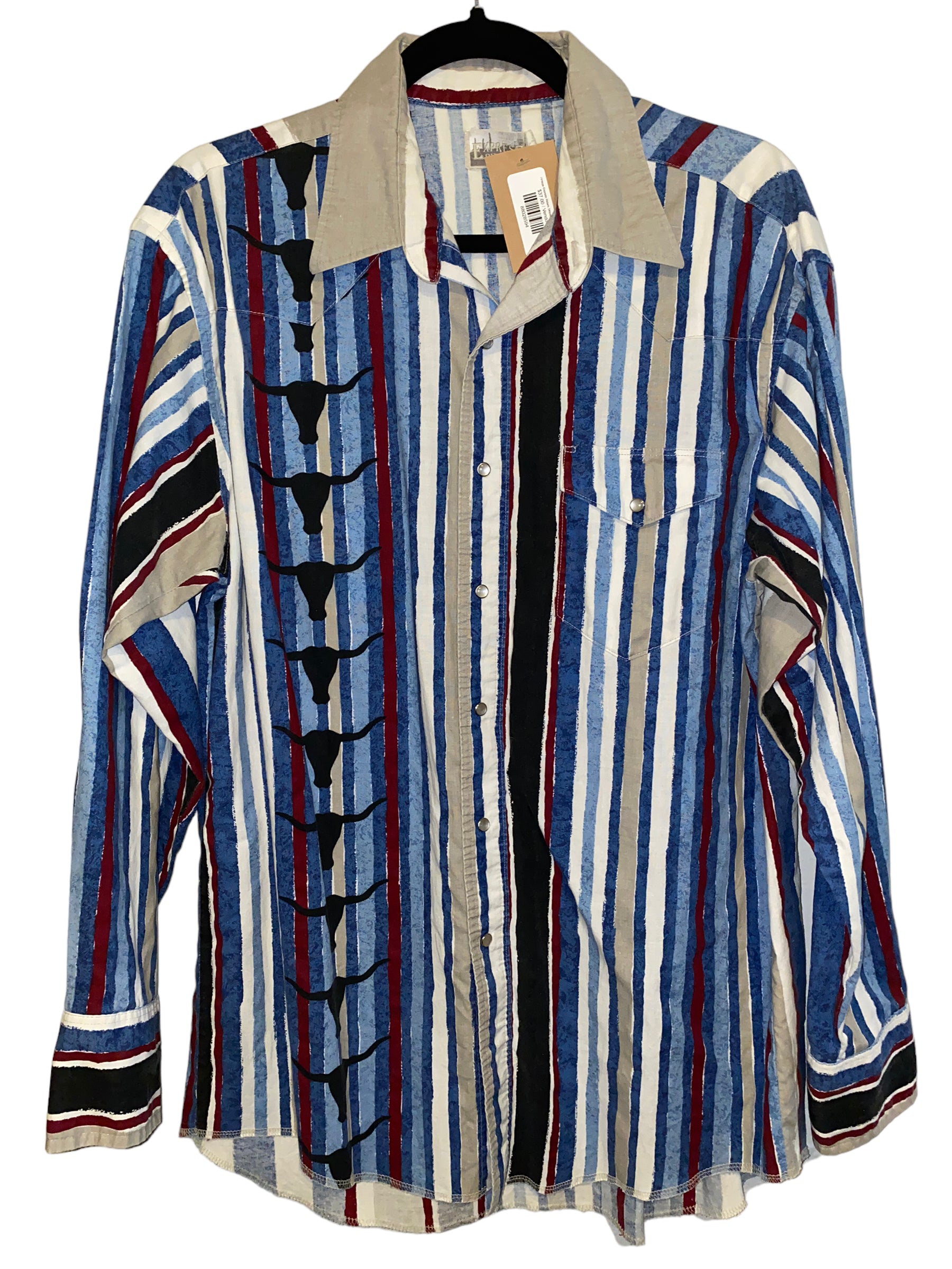 Vintage Express Riders Striped Button Up w Cattle Skull Print